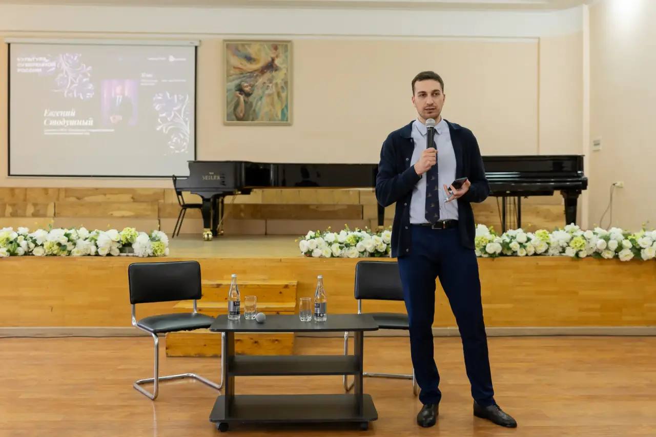 Лекция для студентов прошла 7 апреля в рамках проекта «Культура суверенной России» — комплекса воспитательных мероприятий, который реализуется Академией творческих индустрий «Меганом» совместно с Министерством культуры Российской Федерации. Студенты встретились со спикером в стенах Владикавказского колледжа искусств имени Валерия Гергиева. На встрече Евгений Стодушный рассказал о значении фигуры продюсера и его превращении в «архитектора» культурных систем, а также об акценте на работе над содержанием творческого проекта. По мнению спикера, продюсер сегодня работает в большей степени со смыслами и лишь потом облекает всё в язык цифр и документов. Его задача — выстраивать архитектонику процессов: от идеи до результата, от замысла до устойчивой модели.