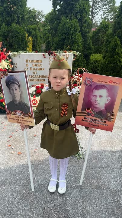 Поклонившись памяти воинов-защитников у Мемориала "Вечный огонь", держа в руках портреты героев семьи, Николь рассказывает стихотворение А. Лазутина "Бессмертный полк"