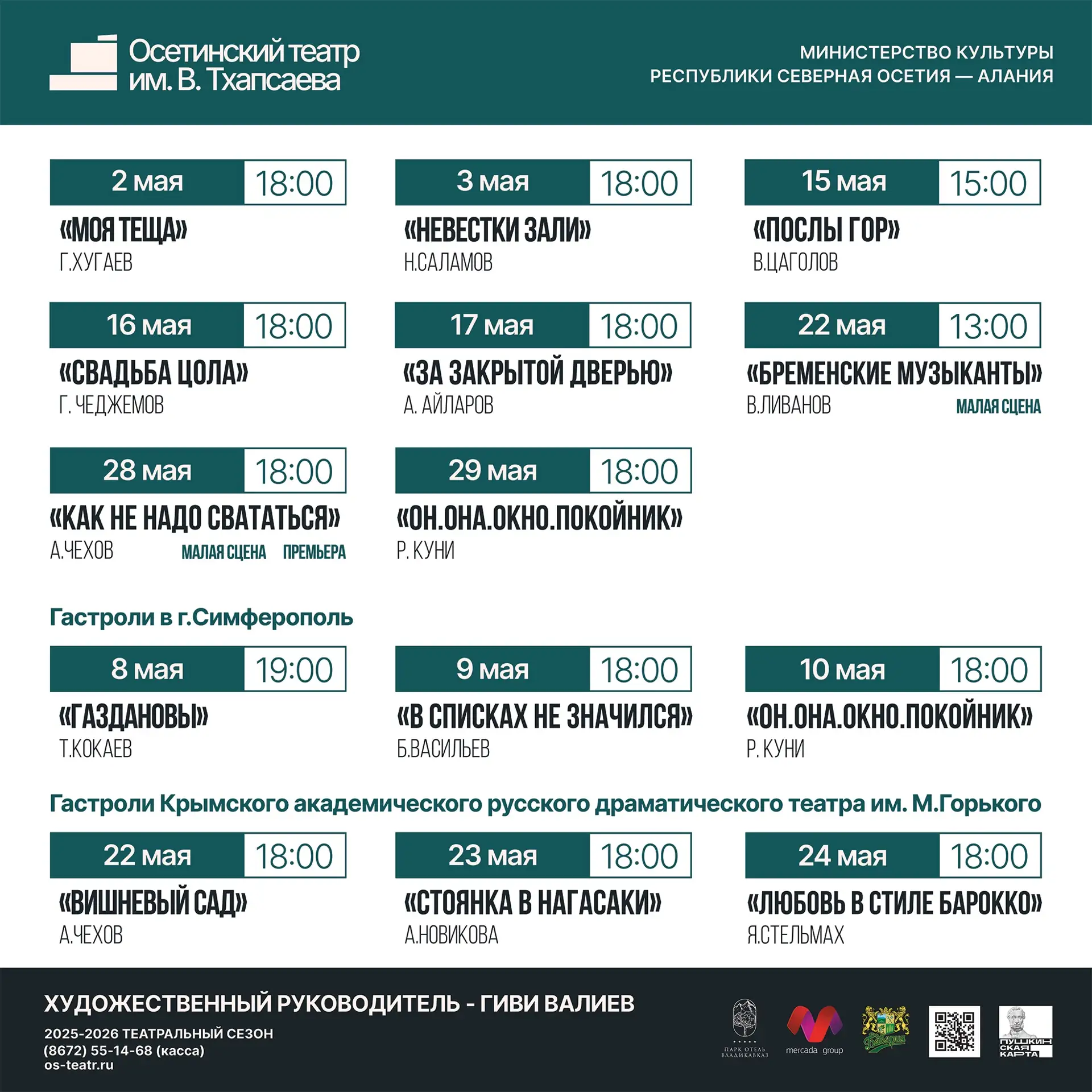 А до и после гастролей — свои хиты на все времена и премьера 28 мая: Чехов «Как не надо свататься» (малая сцена).