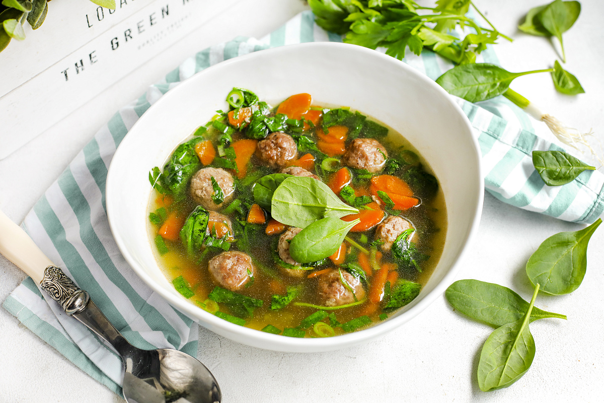 Разогреть духовку до 180 градусов.Перелить бульон в кастрюлю, довести до кипения, а затем приправить по вкусу.Приправьте фарш солью и перцем, сформируйте небольшие фрикадельки и выложите их на противень для запекания. Пеките их в духовке около 14 минут — время может варьироваться в зависимости от модели вашей духовки.Тем временем, очистите морковь и нарежьте её тонкими кольцами. Добавьте морковь в кипящий бульон и варите под крышкой 7-10 минут на среднем огне.Мелко нарежьте шпинат, петрушку и зеленый лук. В конце, добавьте нарезанные зелень и запеченные фрикадельки в суп. Дайте покипеть еще 2-3 минуты.Подавайте суп горячим, наслаждаясь ароматами Италии.Этот легкий и питательный суп не только утолит голод, но и подарит атмосферу праздника в любую погоду. Приятного аппетита!