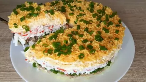 Этот оригинальный салат-торт станет настоящим украшением любого стола. Его гармоничное сочетание ингредиентов и красивый вид привлекут внимание ваших гостей.