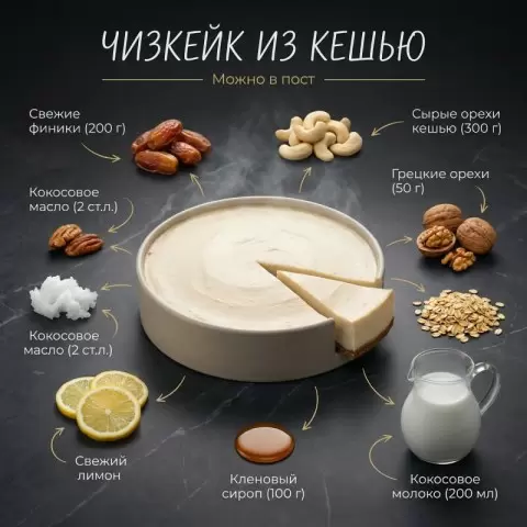 Этот чизкейк может легко стать звездой любого стола. Нежный и сливочный, он не содержит молочных продуктов и покоряет с первого укуса, доказывая, что постный десерт может быть невероятно вкусным!