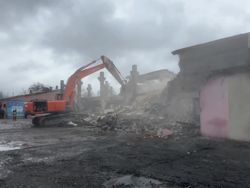 Карьерный экскаватор задействован в разборе завалов на месте обрушившегося после взрыва склада