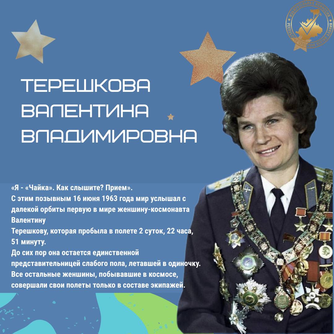 Первой женщиной, побывавшей в космосе, стала Валентина Терешкова, которая в 1963 году совершила полет на «Востоке-6». Сегодня женщины активно участвуют в космических миссиях и играют важную роль в освоении космоса.