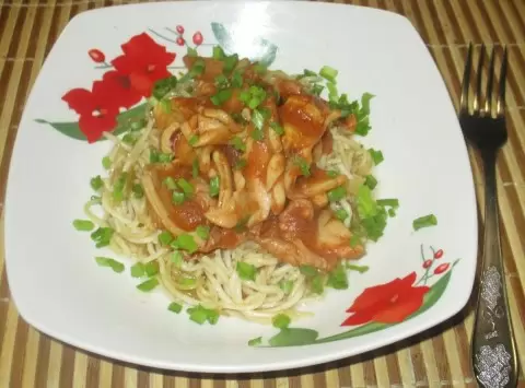 5. Подавайте горячие макароны, сверху добавляя кальмары с овощным соусом и посыпая мелко нарезанным зеленым луком.