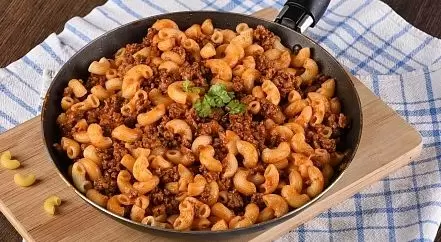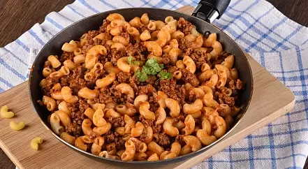 - Макароны: лучше выбирать рожки или спагетти, так как они быстро варятся и хорошо сочетаются с мясом. Для лучшего результата подойдут макароны из твердых сортов пшеницы — они не развариваются при готовке.