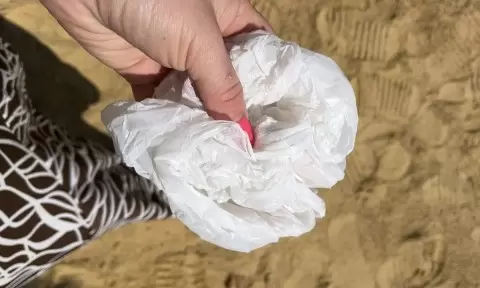Общественные туалеты нередко не радуют чистотой, особенно на пляже. Для создания безопасного пространства можно воспользоваться еще одним лайфхаком. Предварительно, сделайте заготовку: возьмите пакет, сложите его пополам и вырежьте отверстие для сидения.