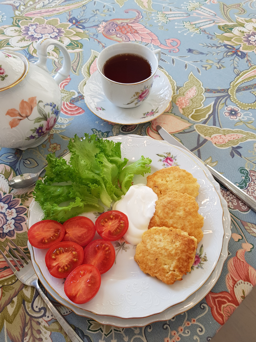 Готовые оладьи стоит подавать на листьях салата с помидорами и щедрой ложкой сметаны. Такое блюдо не только порадует вкусом, но и украсит утренний стол. Приятного аппетита!