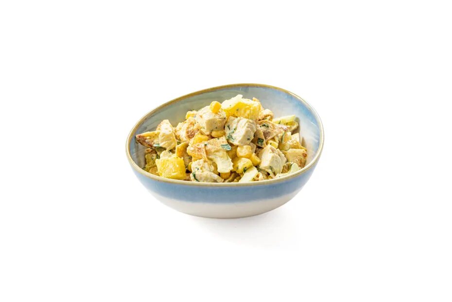Этот салат представляет собой интересную интерпретацию классического блюда из курицы с ананасом. Несколько неожиданных компонентов вносят в него оригинальность. Вместо привычного майонеза используется уникальная заправка, созданная с добавлением петрушки и карри, которая придает салату новый взгляд. А черешковый сельдерей служит отличным дополнением, освежая вкусовую гамму, благодаря сочетанию блинов, ананаса и индейки. Такой вариант закуски не просто разнообразит стол, но и может стать полноценным обедом или ужином.